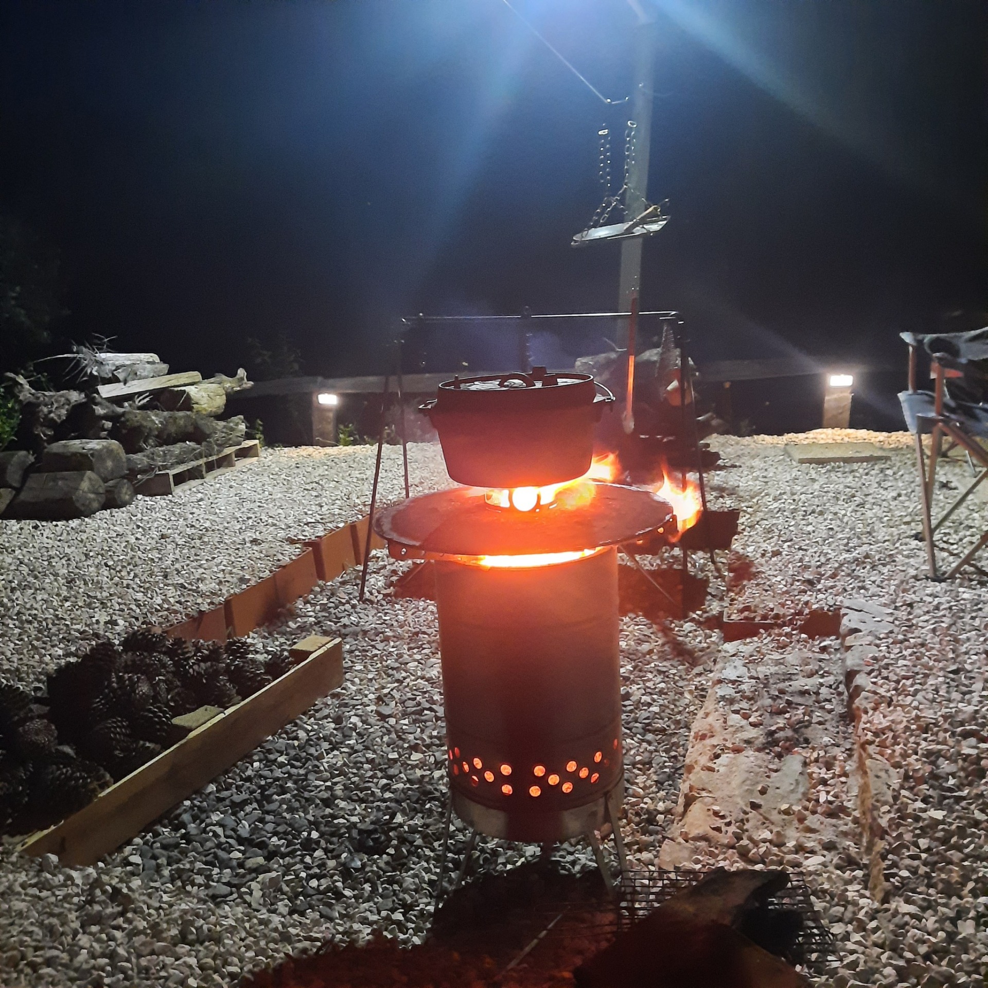 Um dos pontos forte do lodge: cozinhar ao livre em fogo e ferro fundido, experimentar ensopados e refeições lentas junto à fogueira.